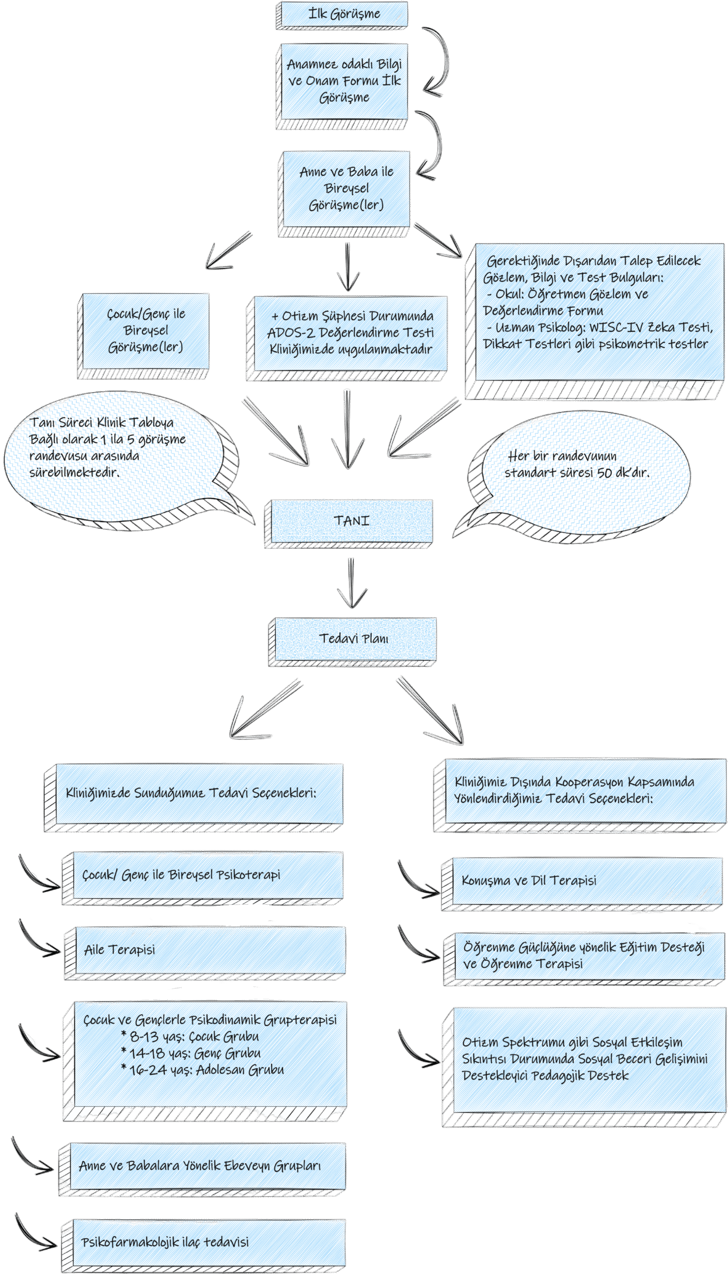 Hedefimiz, sizin ve çocuğunuzun ihtiyaçlarına en uygun tedavi planını birlikte belirlemektir. Bireysel Psikoterapi, aile terapisi, psikofarmakolojik ilaç tedavisi gibi tedavi seçenekleri dışında farklı yaş gruplarına ve ebeveynlere yönelik psikodinamik grupterapisi hizmetleri sunulmaktadır. Gerekli durumlarda öğrenme terapisi gibi spesifik destekler için dışarıda sunulan tedavi hizmetlerine de yönlendirebilmekteyiz.